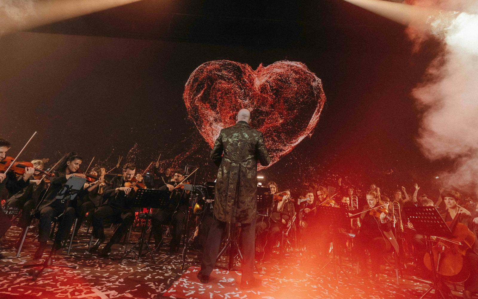 The ensemble brings together around 50 professional musicians who reinterpret well-known electronic tracks through orchestral arrangements.