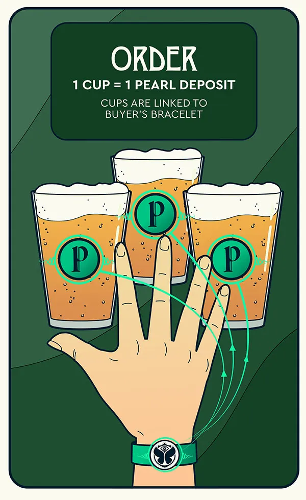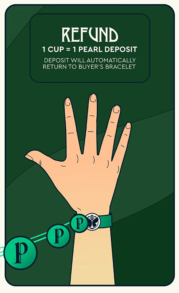 If your order contains a cup, a one Pearl deposit will be charged per cup. The chip of the smart cup is linked to your Bracelet after payment. Once you are done, return the cup to a Cup Return station to have your deposit refunded to your Bracelet or cashless card. No Cup Return = no refund.